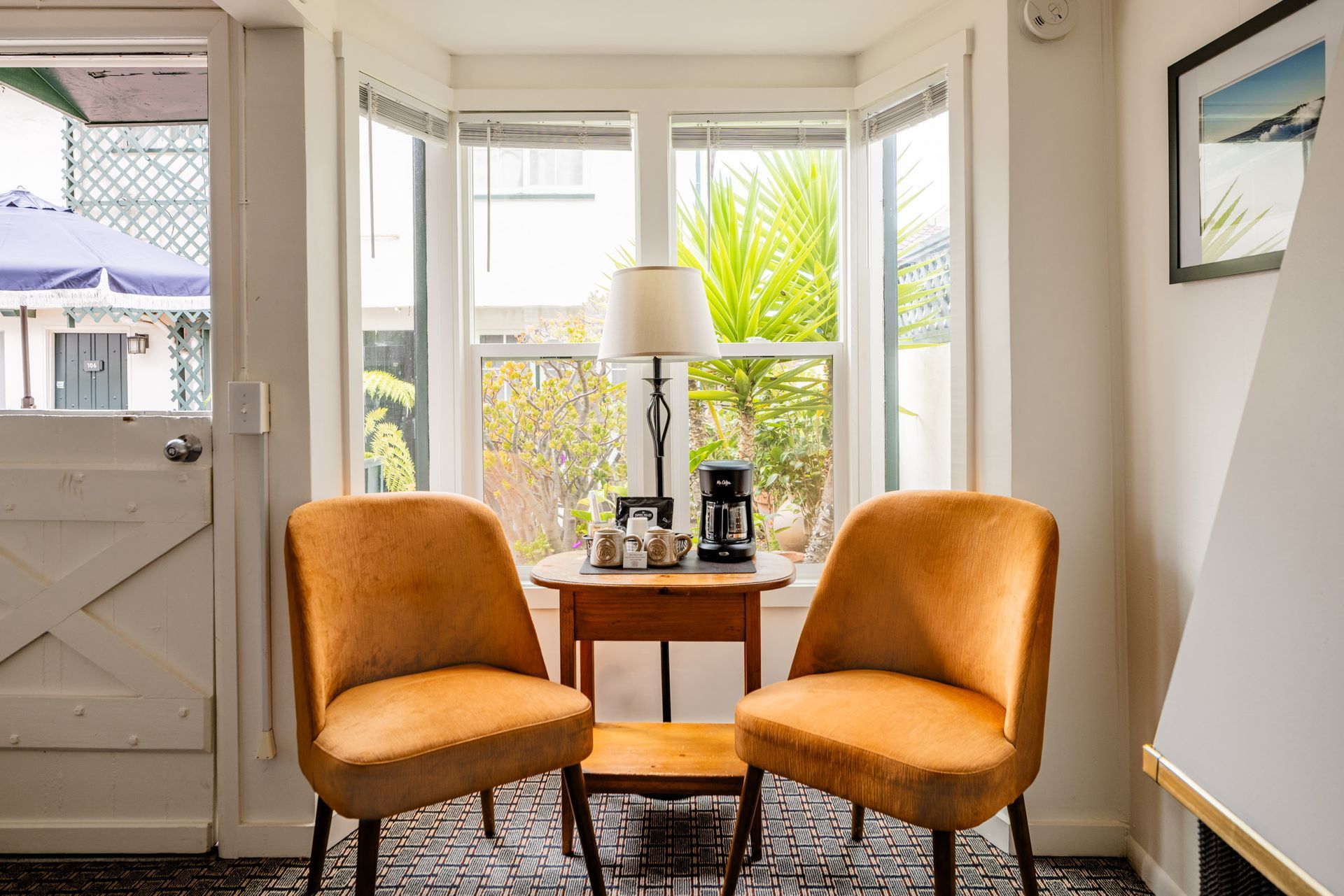 For those seeking extra space and comfort, our Spacious Suite with Fireplace offers a charming and airy retreat in the heart of Carmel-by-the-Sea. Ideal for couples, families, or longer stays, this suite features a cozy fireplace, a king or queen-sized bed, and an additional sitting area for relaxation. Thoughtfully decorated with rustic-chic furnishings, each suite blends timeless elegance with modern convenience. Enjoy a private entrance, mini fridge, coffee maker, and complimentary Wi-Fi, making it the perfect home base for your coastal getaway.